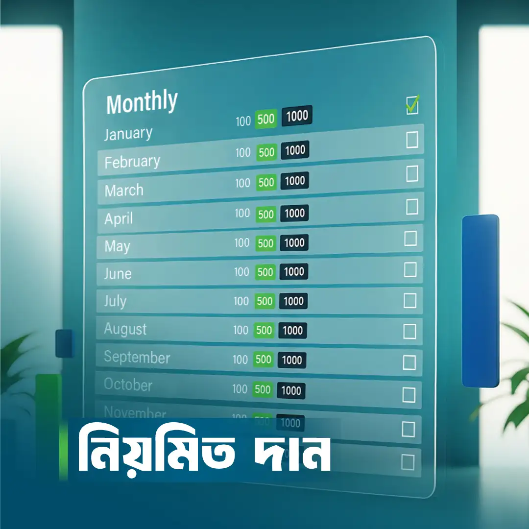 “আল্লাহর কাছে সেই আমলই সবচেয়ে প্রিয়, যা নিয়মিত করা হয়, যদিও তা পরিমাণে কম হয়।”—(সহীহ বুখারী)। আপনার মাসিক ক্ষুদ্র অনুদান আমাদের দীর্ঘমেয়াদী প্রকল্পগুলোর ভিত্তি স্থাপন করে। এতিম শিশুর মাসিক ভরণপোষণ, মাদরাসার শিক্ষকের বেতন অথবা কোনো বিধবার নিয়মিত খাদ্য সহায়তার মতো টেকসই পরিকল্পনাগুলো আপনার এই ধারাবাহিক অনুদানের উপর নির্ভরশীল। মাসিক ১০০, ৫০০ বা ১০০০ টাকার একটি নিয়মিত দান আমাদের কাজের স্থিরতা নিশ্চিত করে।